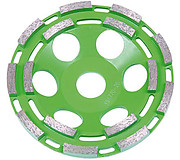 Алмазные чашки для сухого шлифования бетона, клинкера, искусственного и натурального камня и других твердых поверхностей. Двухрядное исполнение для грубой очистки поверхности. Высокая производительность и период стойкости.