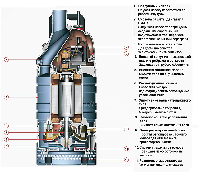 • Система защиты двигателя SMART, защищает насос от повреждений при неправильном подключении фаз, перебоев энергоснабжения и перегрева.