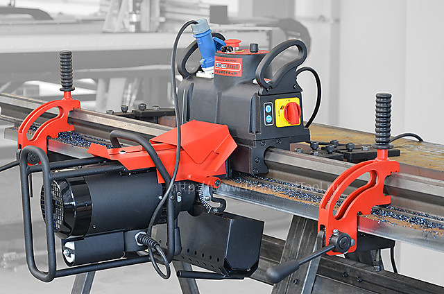 Мощный фаскорез Promotech ABM 28 с автоматической подачей и реверсом. Станок устанавливается на обрабатываемую деталь при помощи быстрых независимых захватов. Станок жестко закреплен на направляющей, которая крепко прижимается при помощи захватов. Скорость реза фаски составляет 350-500 мм в минуту. Движение станка в автоматическом режиме происходит плавно и оптимально быстро, исключая ошибки оператора. Фаска получается идеально ровная и гладкая. Основной особенностью данного станка является его возможность снимать фаску как сверху листа, так и снизу, то-есть под отрицательным углом, что сокращает время на переворачивание обрабатываемого листа.
