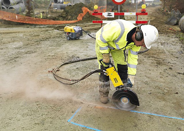 • Гидравлическая пила Atlas Copco LS 14 на передвижной тележке для ровного и быстрого разрезания асфальта