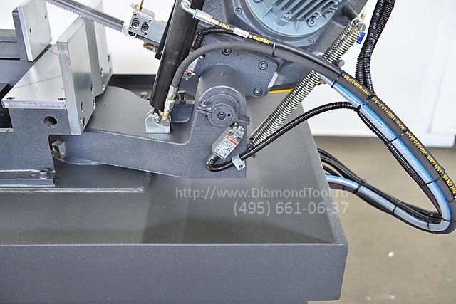 - Гидромеханическая система натяжения ленточнопильного полотна с манометром, обеспечивает надежную фиксацию рекомендуемого значения натяжения.