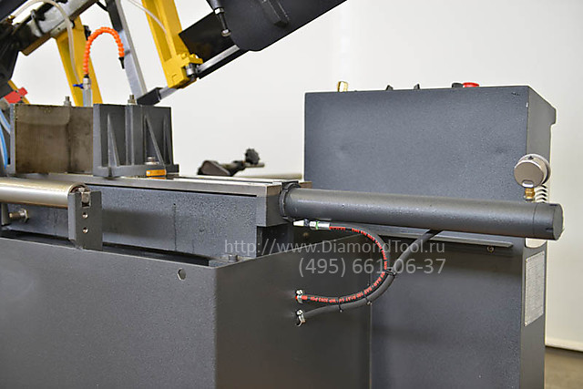 - Гидромеханическая система натяжения ленточнопильного полотна с манометром, обеспечивает надежную фиксацию рекомендуемого значения натяжения.