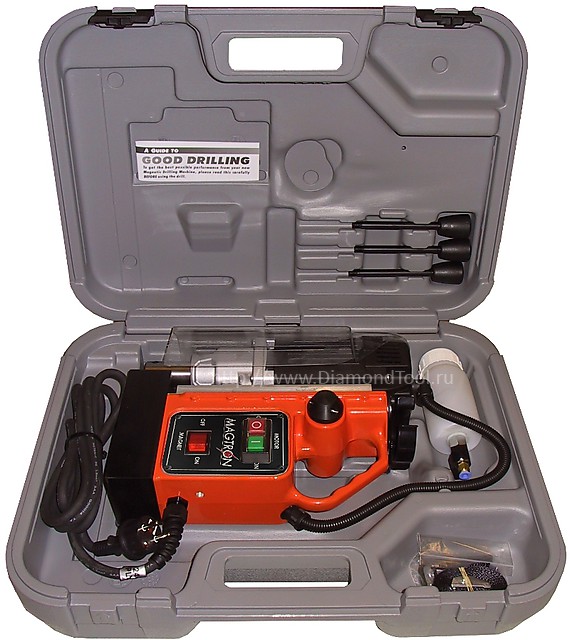 Станок обладает большими возможностями - лучший выбор для основного применения. Мощный и компактный двигатель, оснащенный двухскоростным редуктором, позволяет кольцевым сверлом сверлить отверстия до 50 мм диаметром и глубиной. В комплекте станка стандартно присутствуют система подачи СОЖ и быстрозажимной держатель для кольцевых сверл типа Weldon, обычно поставляемых за отдельную плату. В результате за разумные деньги вы получаете машину полностью готовую к работе, относительно легкую, мощную и надежную. Двигатель станка не перегружен электронными системами, а отдает всю мощность полностью. Разумеется, если Вы хотите, то можете использовать этот станок со спиральными сверлами диаметром до 19 мм. Как с коническим хвостовиком, так и с цилиндрическим. В последнем случае необходим трехкулачковый патрон, поставляемый отдельно.